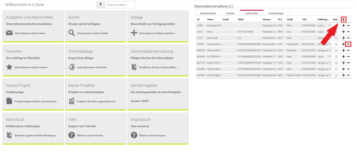 Aufgrund von unzumutbaren Preiserhöhungen hat sich das Fahrradunternehmen dazu entschlossen, einen seiner Lieferanten durch einen günstigeren Anbieter zu ersetzen. Um diese Änderung im System festzuhalten, öffnet der Mitarbeiter die Kachel "Stammdatenverwaltung" in eCOUNT Dokumentenverwaltung. Nun liegen ihm Kostenstellen, Konten, Kostenträger und der benötigte Lieferantenbereich vor. Jenen Lieferanten, der nicht weiter beauftragt wird, entfernt er mithilfe des - Symbols. Um den neuen Kreditor anzulegen, wählt er das + Symbol aus, füllt alle erforderlichen Angaben aus und speichert die Informationen.