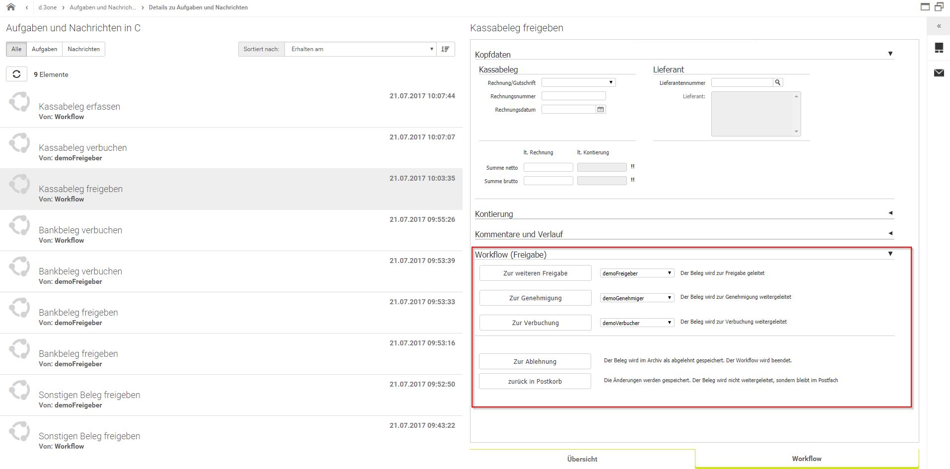 Bei erfolgreicher Prüfung und Genehmigung gelangt die Rechnung in den Aufgabenkorb des Verbuchers. Ist die Rechnung ordentlich verbucht, wandert sie in das elektronische Archiv. Von da aus kann sie je nach Bedarf abgerufen werden.