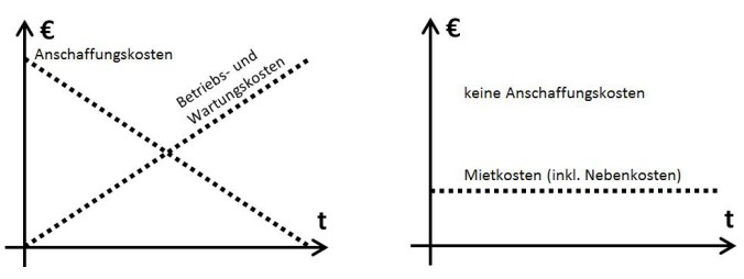 Durch die Kosten in bekanntem Umfang können Unternehmen ihre Ausgaben kurz-, mittel- und langfristig planen. Diese Möglichkeit sind bei ERP-Umsetzungen mittels Standardsoftwareprogrammen nicht vorhanden. In der folgenden Abbildung wird schematisch ein Vergleich von anfallenden Kosten zwischen einer klassischen ERP-Lösung und Cloud-ERP-Lösungen dargestellt.